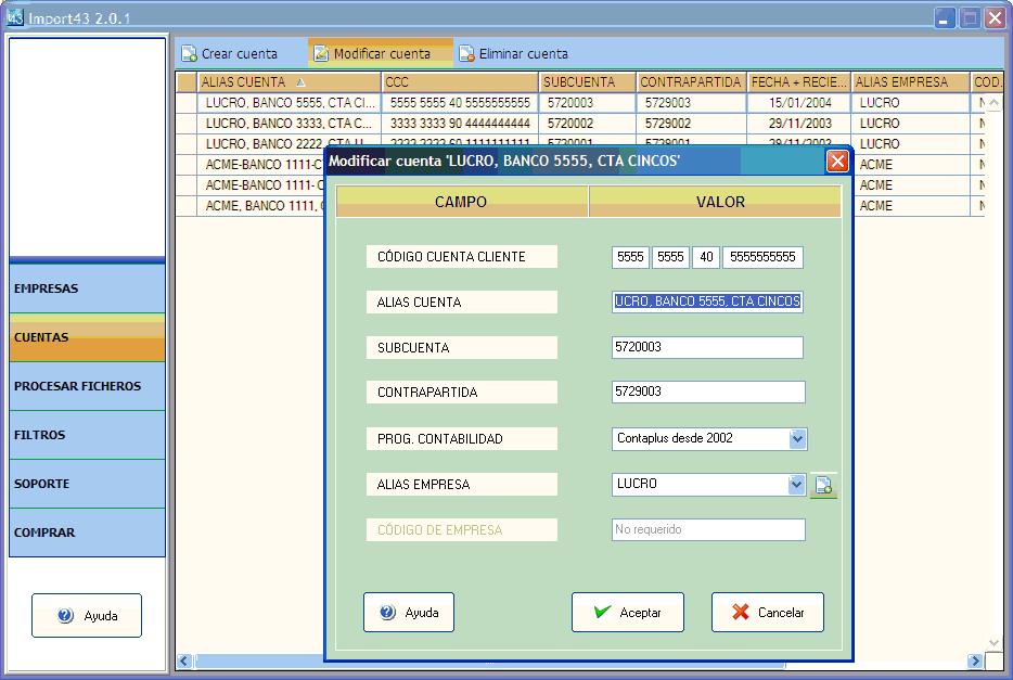 de cuentas de tu programa de contabilidad. Import43 genera un asiento