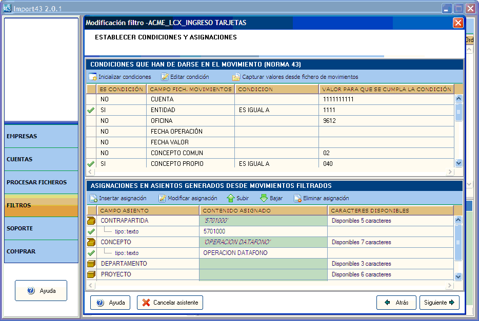 Una condición puede ser 'Si Concepto1 CONTIENE el CIF de